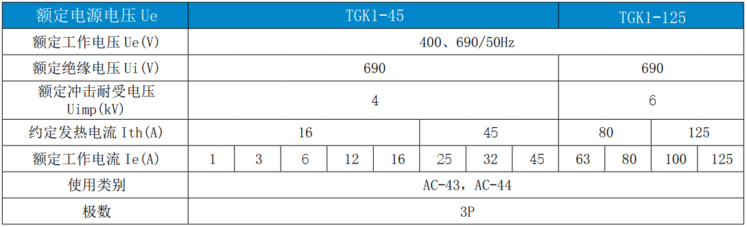 TGK1 系列控制与保护开关电器(CPS)( 以下简称“开关”),主要适用于交流50Hz(或60Hz)、额定工作电压690V、额定工作电流 1A 至 125A、控制器整定电流 0.4A 至 125A、控制电机功率 0.12kW至 55kW 的电路中,能够接通、承载和分断正常条件下 ( 包括规定的过载条件 ) 的电流,也能接通、承载一定时间和分断规定的非正常条件下 ( 如短路 ) 的电流。